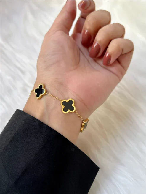 Embrace luck and style with our Black Four-Leaf Clover Bracelet. Featuring a sleek design adorned with a four-leaf clover motif in black, this bracelet exudes charm and sophistication. Perfect for adding a touch of elegance to any outfit, it's an ideal accessory for those who appreciate symbolic and fashionable jewelry.